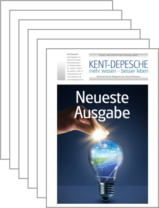 Michael Kents „Depesche“ ist eine werbefreie Abonnenten-Zeitschrift, die seit 2001 in gedruckter Form alle 14 Tage neu erscheint; sie ist auch online bzw. als ePaper (PDF) zum Download erhältlich. Alle Artikel orientieren sich an der Anwendbarkeit und Umsetzung im Leben, getreu unserem Motto „mehr wissen, besser leben “. Hier lesen Sie, was nicht in der Zeitung steht: verschwiegene Hintergründe, aber auch Anregendes, Aufbauendes, Motivierendes, Humorvolles ...