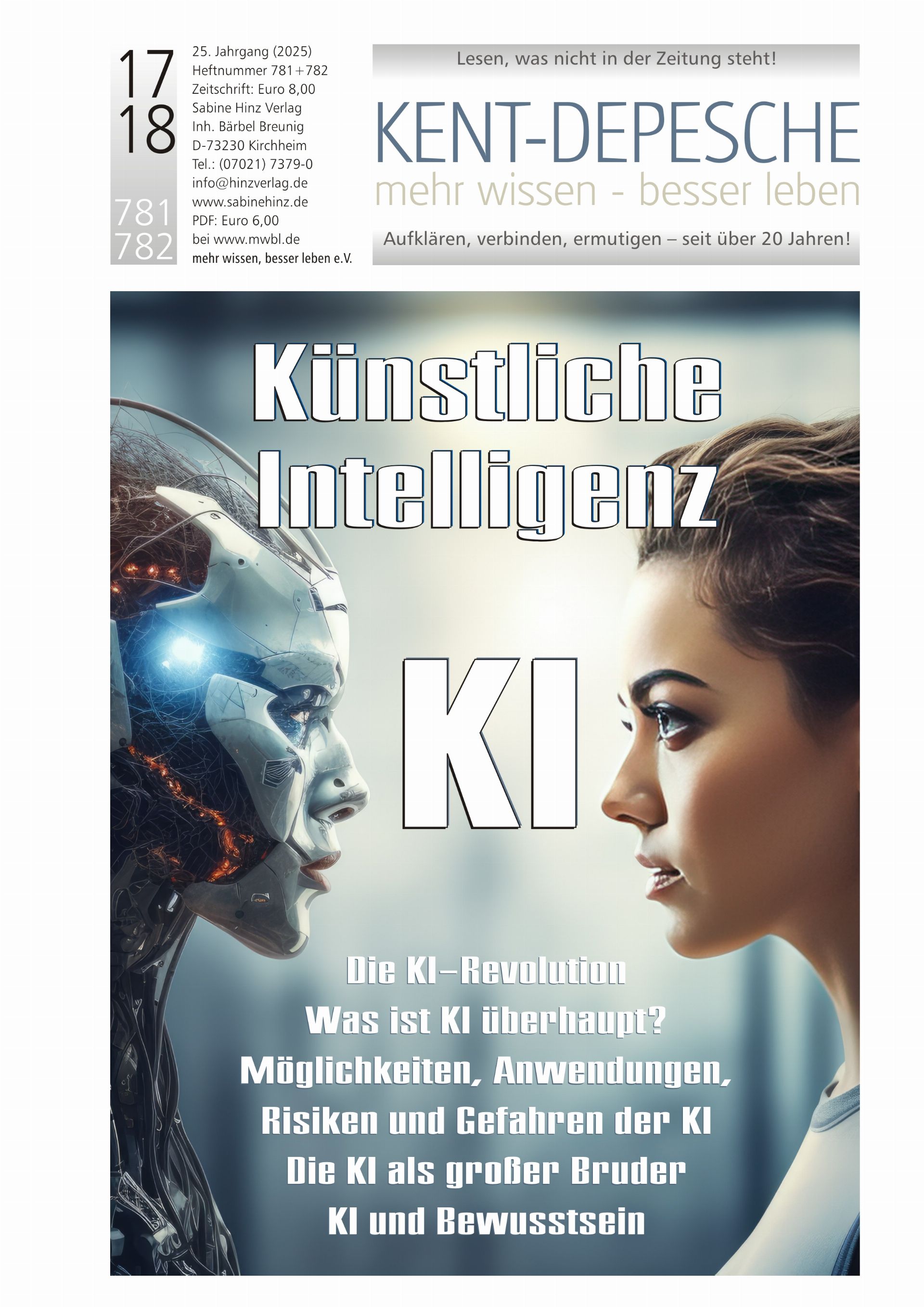 Depesche 17+18/2025, Heftnummern 781+781 (PDF)Künstliche Intelligenz KI Wichtigste Stichwörter: • Die KI-Revolution• Was ist KI überhaupt? Wie funktioniert sie? • Möglichkeiten, Chancen und heutige Anwendungen der KI • Risiken und Gefahren der KI, z.B.: Die KI als großer Bruder• KI und BewusstseinPortrait: GANZ NEU: Musikalbum von MiKe: „Ich bin"Hauptartikel von Michael Kent Künstliche ...