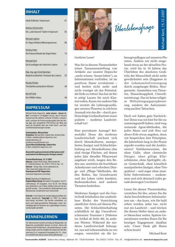 • Effektive Mikroorganismen: Kleine Helfer ganz groß! Die Wunder der EM-Anwendung in der Landwirtschaft und global. Bodenfruchtbarkeit – und wie man sie regeneriert. Bodenleben, Regenwürmer, Humus, Säuren/Basen, Kunstdüngung, nat. Dung. Der „Darm des Bodens”: EM, natürliche Kreisläufe und nat. Gleichgewicht.