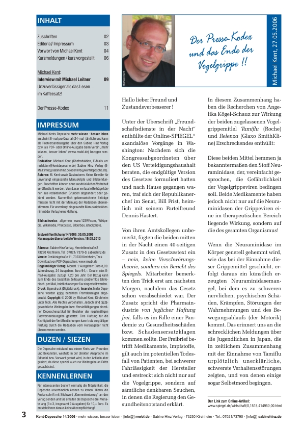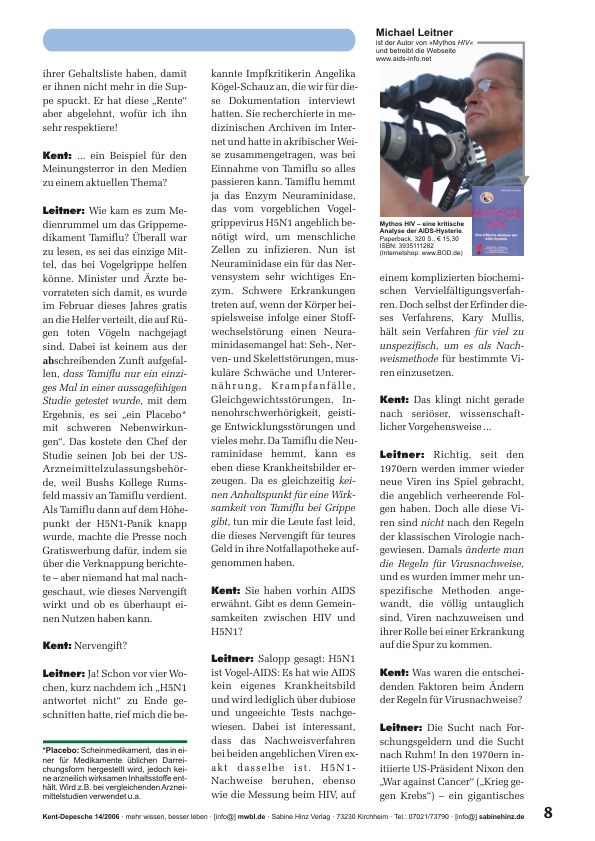 »Der Buchautor und Filmemacher Michael Leitner garniert sein fundiertes Fachwissen zur AIDS- und Virenthematik im heutigen Interview ab Seite 7 mit jeder Menge pfiffigem bzw. gepfeffertem Humor. Doch während Michael neue Fakten zur Vogelgrippe präsentiert, zeigt er nebenbei weitere Facetten der Problematik auf – wie etwa, mit welchen konkreten Methoden Ärzte und Journalisten von der Pharmaindustrie zu Günstlingen degradiert werden, wie die Virenerfindung überhaupt zustande kam ... und vieles Spannende mehr.«