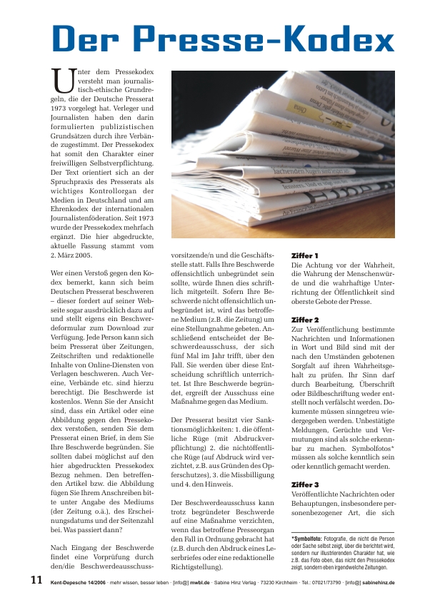 »Wusstest Du, dass es so etwas wie einen Pressekodex gibt? Dieser Kodex legt die Grundregeln der ethischen, journalistisch Arbeit fest. Der deutsche Presse-Rat hat ihn 1973 formuliert und seither aktualisiert. Die Presseverbände haben sich freiwillig dazu verpflichtet, diesem Kodex zu folgen. Der Kodex gebietet beispielsweise in Ziffer 1: „Die Achtung vor der Wahrheit ... und die wahrhafte Unterrichtung der Öffentlichkeit sind oberste Gebote der Presse“. Bei der Vogelgrippe haben die Massenmedien diesen Pfad aber eindeutig verlassen und sind satt dessen auf den Zug der Panikmache aufgesprungen.«