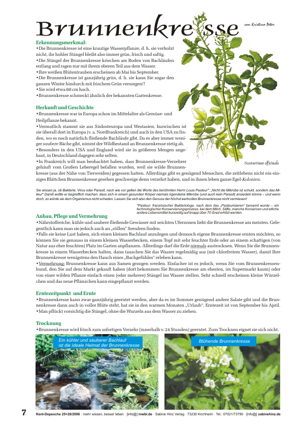 »Die Brunnenkresse (Nasturtium officinale) ist eine ausdauernde, krautige Pflanze aus der Familie der Kreuzblütler (Brassicaceae). Ursprünglich stammt sie aus Europa und Asien, hat sich aber weltweit verbreitet und wird heute in vielen gemäßigten Regionen kultiviert. Sie wurde bereits in der Antike als Heil- und Gewürzpflanze geschätzt. Die Brunnenkresse ist bekannt für ihren scharfen, pfeffrigen Geschmack und wird häufig in der Küche verwendet. Sie kann roh in Salaten, Sandwiches und Smoothies oder als Gewürz in Suppen und Saucen verwendet werden. Aufgrund ihres hohen Gehalts an Vitamin C, Eisen und anderen Nährstoffen ist sie auch als gesundheitsförderndes Lebensmittel geschätzt.«