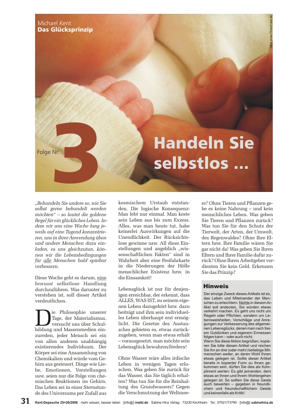 »„Behandeln Sie andere so, wie Sie selbst gerne behandelt werden möchten“ – so lautet die goldene Regel für ein glückliches Leben. Indem wir uns eine Woche lang jeweils auf eine Tugend konzentrieren, uns in ihrer Anwendung üben und andere Menschen dazu einladen, es uns gleichzutun, können wir die Lebensbedingungen für alle Menschen bald spürbar verbessern. Diese Woche geht es darum, eine bewusst selbstlose Handlung durchzuführen. Was darunter zu verstehen ist, soll dieser Artikel verdeutlichen.«