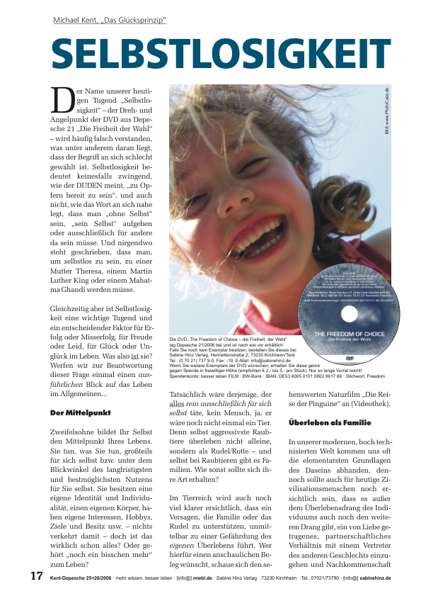 »Der Name unserer heutigen Tugend „Selbstlosigkeit“ wird häufig falsch verstanden, was unter anderem daran liegt, dass der Begriff an sich schlecht gewählt ist. Selbstlosigkeit bedeutet keinesfalls zwingend, wie der DUDEN meint, „zu Opfern bereit zu sein“. und auch nicht, wie das Wort an sich nahe legt, dass man „ohne Selbst“ sein, „sein Selbst“ aufgeben oder ausschließlich für andere da sein müsse. Und nirgendwo steht geschrieben, dass man, um selbstlos zu sein, zu einer Mutter Theresa, einem Martin Luther King oder einem Mahatma Ghandi werden müsse. Gleichzeitig aber ist Selbstlosigkeit eine wichtige Tugend und ein entscheidender Faktor für Erfolg oder Misserfolg, für Freude oder Leid, für Glück oder Unglück im Leben. Was also ist sie? Werfen wir zur Beantwortung dieser Frage einmal einen ausführlichen Blick auf das Leben im Allgemeinen…«