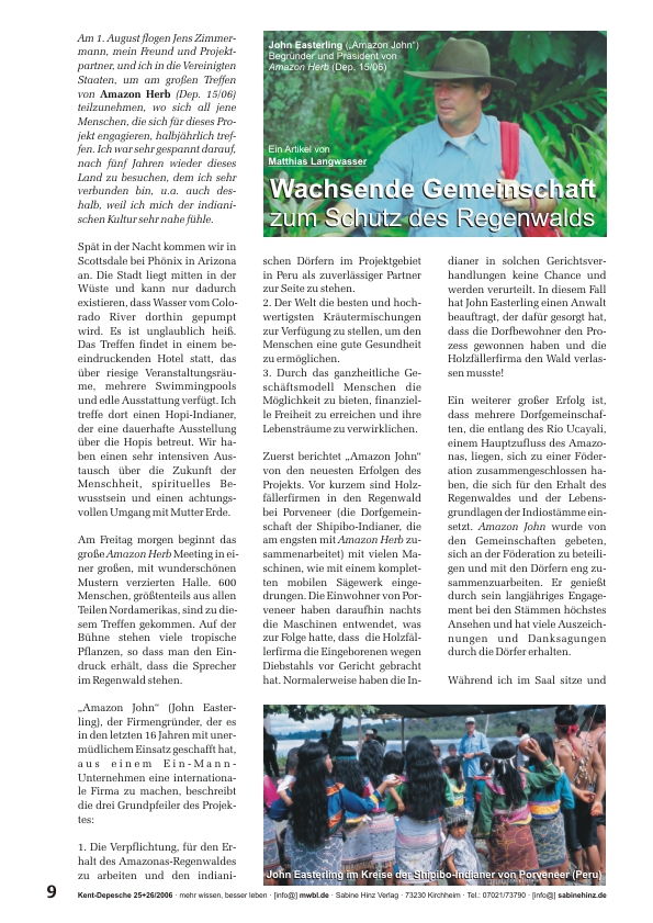 »Am 1. August flogen Jens Zimmermann, mein Freund und Projektpartner, und ich in die Vereinigten Staaten, um am großen Treffen von Amazon Herb (Dep. 15/06) teilzunehmen, wo sich all jene Menschen, die sich für dieses Projekt engagieren, halbjährlich treffen. Ich war sehr gespannt darauf, nach fünf Jahren wieder dieses Land zu besuchen, dem ich sehr verbunden bin, u.a. auch deshalb, weil ich mich der indianischen Kultur sehr nahe fühle.«