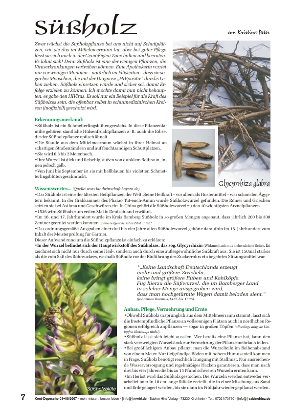 »Zwar wächst die Süßholzpflanze bei uns nicht auf Schuttplätzen, wie sie das im Mittelmeerraum tut, aber bei guter Pflege lässt sie sich auch in der Gemäßigten Zone halten und beernten. Es lohnt sich! Denn Süßholz ist eine der wenigen Pflanzen, die Viruserkrankungen vertreiben können. Eine Apothekerin verriet mir vor wenigen Monaten – natürlich im Flüsterton – dass sie sogar bei Menschen, die mit der Diagnose „HIVpositiv“ durchs Leben ziehen, Süßholz einsetzen würde und sicher sei, damit Erfolge erzielen zu können. Ich möchte damit nun nicht behaupten, es gäbe den HIVirus. Es soll nur ein Beispiel für die Kraft des Süßholzes sein, die offenbar selbst in schulmedizinischen Kreisen (inoffiziell) geschätzt wird.«