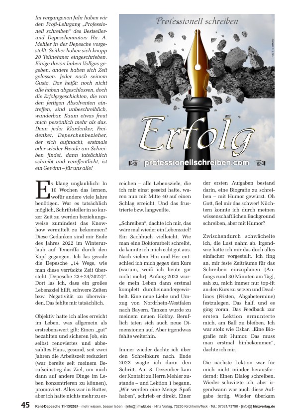 Im vergangenen Jahr haben wir den Profi-Lehrgang „Professionell schreiben“ des Bestseller- und Depeschenautors Ha. A. Mehler in der Depesche vorgestellt. Seither haben sich knapp 20 Teilnehmer eingeschrieben. Einige davon haben Vollgas gegeben, andere haben sich Zeit gelassen. Jeder nach seinem Gusto. Das heißt: noch nicht alle haben abgeschlossen, doch die Erfolgsgeschichten, die von den fertigen Absolventen eintreffen, sind unbeschreiblich, wunderbar. Kaum etwas freut mich persönlich mehr als das. Denn jeder Klardenker, Freidenker, Depeschenbezieher, der sich aufmacht, erstmals oder wieder Freude am Schreiben findet, dann tatsächlich schreibt und veröffentlicht, ist ein Gewinn – für uns alle!