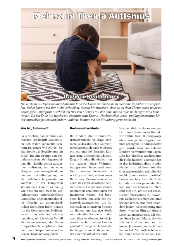 Die letzte Depesche über Autismus fand ich klasse und habe sie in meinem Umfeld empfohlen. Dabei konnte ich mir nicht verkneifen, darauf hinzuweisen, dass es zu dem Thema noch mehr zu sagen gäbe – und prompt erhielt ich Post von Michael Kent mit der Bitte, meine Infos noch ergänzend beizutragen. Da ich Ende Juli wieder ein Seminar zum Thema „Hochsensible, hoch- und hypersensitive Kinder sinnvoll begleiten und fördern“ anbiete, komme ich der Einladung gerne nach.