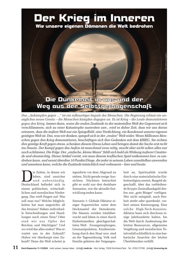 Gegen etwas anzukämpfen, ist ein reflexartiger Impuls. Die Regierung erlässt ein unsägliches neues Gesetz – die Menschen kämpfen dagegen an. Es ist Krieg – die Leute demonstrieren gegen den Krieg. Immer dann, wenn die realen Zustände in der materiellen Welt der Gegenwart sich verschlimmern, wird es daher Zeit, dass wir uns daran erinnern, dass die äußere Welt nur ein Spiegelbild, eine Verdichtung, ein Kondensat unserer eigenen geistigen Welt ist. Das, was wir denken, spiegelt sich in der „realen“ Welt wider. Wenn Millionen Menschen gegen den Krieg demonstrieren, beschäftigen sich ihre Gedanken mit dem KRIEG. Sie richten ihre geistige Kraft gegen etwas, schenken diesem Etwas Leben und bringen damit die Sache erst recht ins Dasein. Der Kampf gegen das Außen ist manchmal zwar nötig, macht aber nicht selten alles nur noch schlimmer. Die Folge: Der „einfache, kleine Mann“ fühlt sich bald als Wirkung äußerer Umstände und ohnmächtig. Dieser Artikel verrät, wie man diesem teuflischen Spiel entkommen bzw. es umdrehen kann, und nennt überdies 10 Punkte/Dinge, die jeder in seinem Leben unmittelbar anwenden und umsetzen kann, welche die Zustände tatsächlich real verbessern – hier und heute.