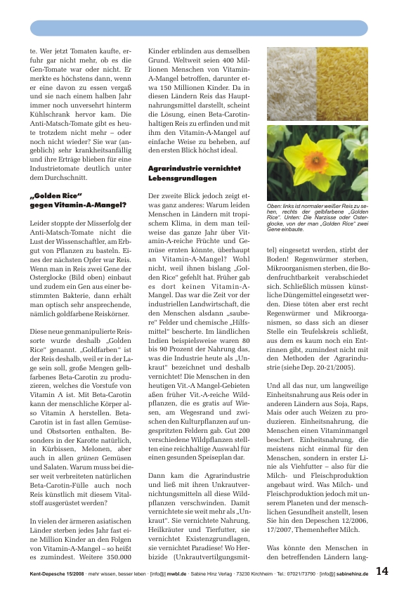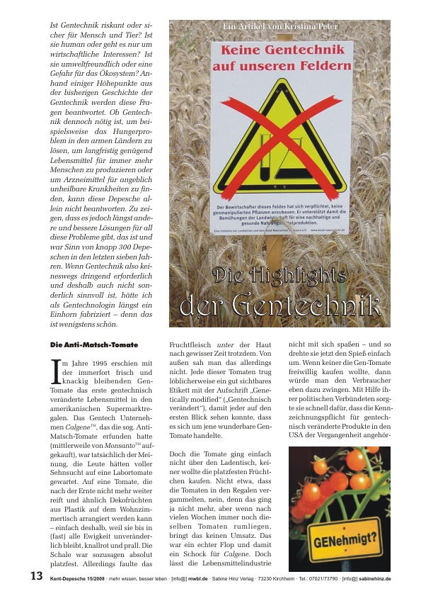 »Ist Gentechnik riskant oder sicher für Mensch und Tier? Ist sie human oder geht es nur um wirtschaftliche Interessen? Ist sie umweltfreundlich oder eine Gefahr für das Ökosystem? Anhand einiger Höhepunkte aus der bisherigen Geschichte der Gentechnik werden diese Fragen beantwortet. Ob Gentechnik dennoch nötig ist, um beispielsweise das Hungerproblem in den armen Ländern zu lösen, um langfristig genügend Lebensmittel für immer mehr Menschen zu produzieren oder um Arzneimittel für angeblich unheilbare Krankheiten zu finden, kann diese Depesche allein nicht beantworten. Zu zeigen, dass es jedoch längst andere und bessere Lösungen für all diese Probleme gibt, das ist und war Sinn von knapp 300 Depeschen in den letzten sieben Jahren. Wenn Gentechnik also keineswegs dringend erforderlich und deshalb auch nicht sonderlich sinnvoll ist, hätte ich als Gentechnologin längst ein Einhorn fabriziert – denn das ist wenigstens schön.« (Diese Depesche enthält Teil 1, Teil 2 folgt in Doppeldepesche 16/2008).
