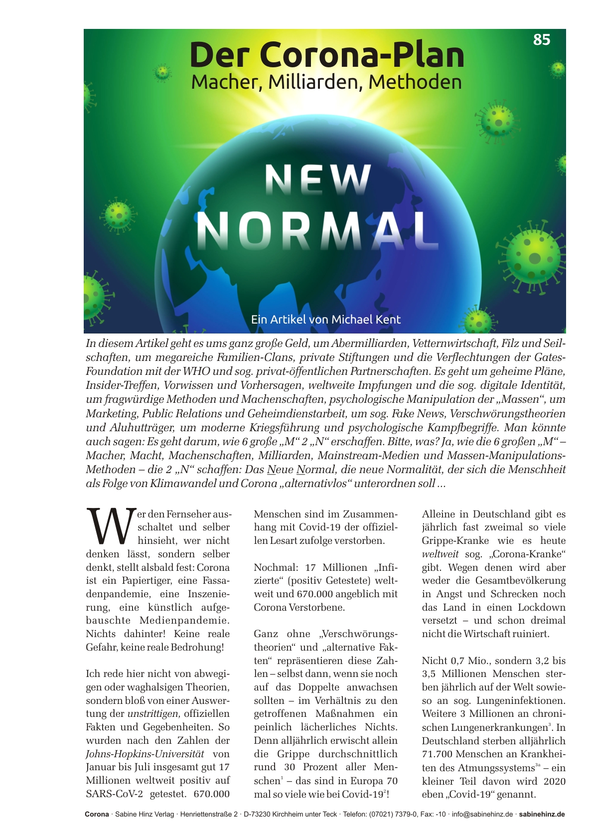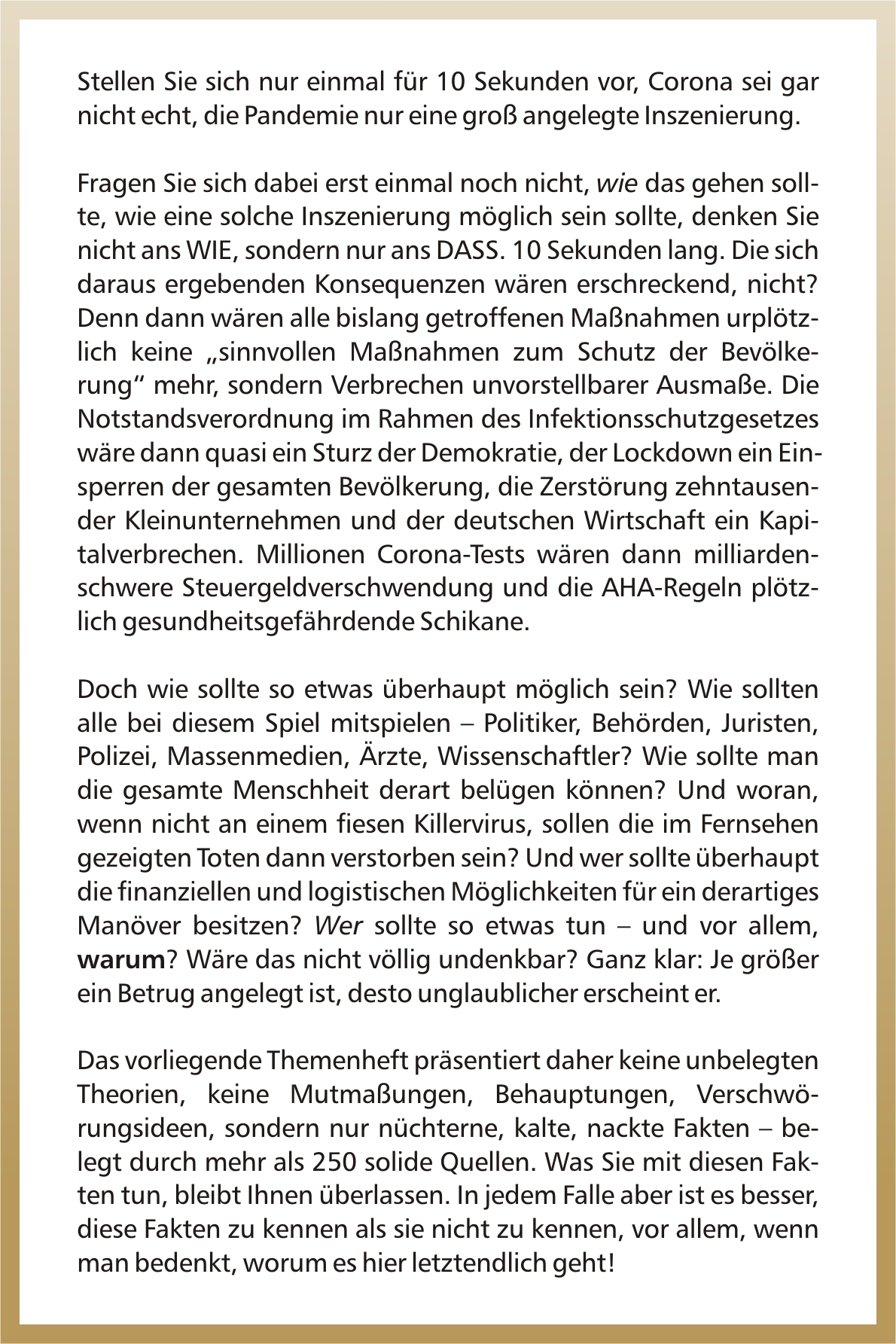 Dieses Themenheft präsentiert keine unbelegten Theorien, Mutmaßungen, Behauptungen, Verschwörungsideen, sondern nur nüchterne, kalte, nackte Fakten – belegt durch mehr als 250 solide Quellen. Was Sie mit diesen Fakten tun, bleibt Ihnen überlassen. In jedem Falle aber ist es besser, diese Fakten zu kennen als sie nicht zu kennen, vor allem, wenn man bedenkt, worum es hier letztendlich geht!
