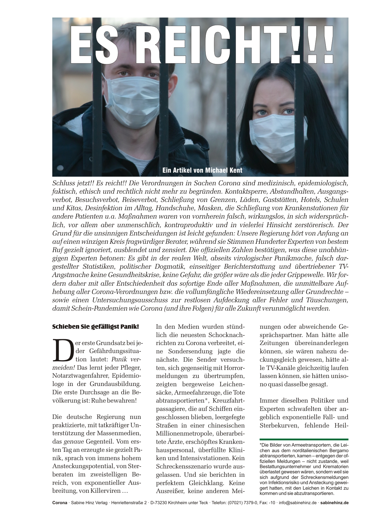 ES REICHT!!! Sofortiges Ende aller Corona-Maßnahmen. Untersuchungsausschuss zur restlosen Aufdeckung aller Fehler und Täuschungen. Warum Masken gesundheitsschädlich, nutzlos, entwürdigend sind. Warum alle „Schutzmaßnahmen“ von vornherein sinnfrei waren – und sind! Warum Lockdown und Maßnahmen mehr Tote auf dem Gewissen haben als Covid-19.