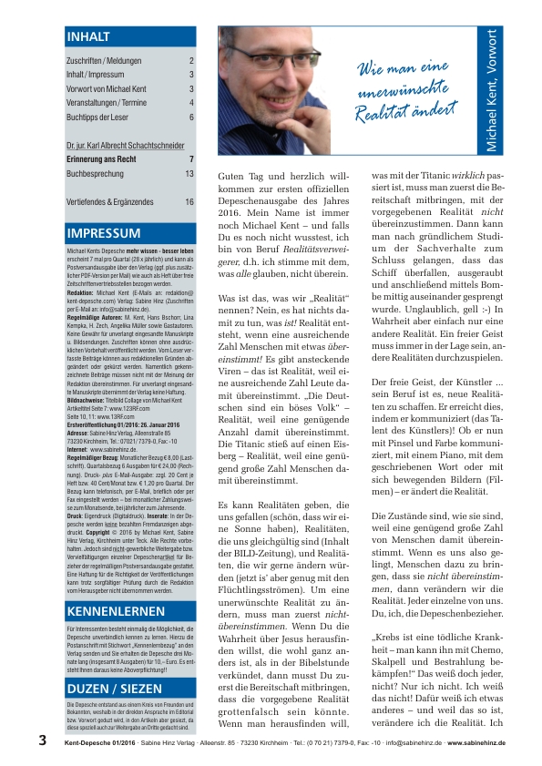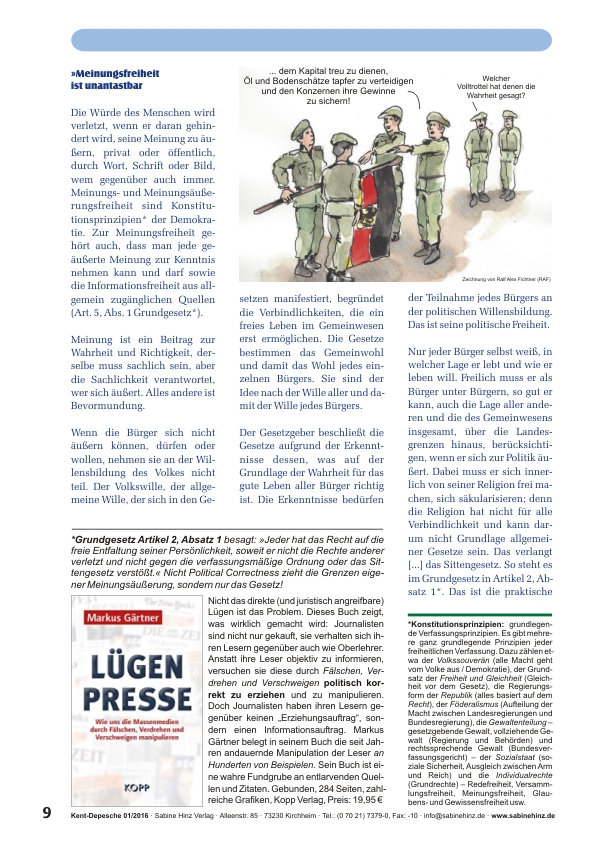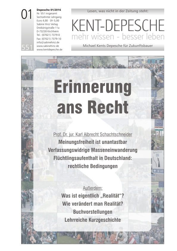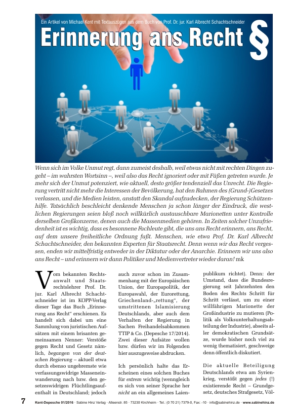 Einleitung: »Wenn sich im Volke Unmut regt, dann zumeist deshalb, weil etwas nicht mit rechten Dingen zugeht – im wahrsten Wortsinn –, weil also das Recht ignoriert oder mit Füßen getreten wurde. Je mehr sich der Unmut potenziert, wie aktuell, desto größer tendenziell das Unrecht. Die Regierung vertritt nicht mehr die Interessen der Bevölkerung, hat den Rahmen des (Grund-)Gesetzes verlassen, und die Medien leisten, anstatt den Skandal aufzudecken, der Regierung Schützenhilfe. Tatsächlich beschleicht denkende Menschen ja schon länger der Eindruck, die westlichen Regierungen seien bloß noch austauschbare Marionetten unter Kontrolle derselben Großkonzerne, denen auch die Massenmedien gehören. In Zeiten solcher Unzufriedenheit ist es wichtig, dass es besonnene Fachleute gibt, die uns ans Recht erinnern, ans Recht, auf dem unsere freiheitliche Ordnung fußt. Menschen, wie etwa Prof. Dr. Karl Albrecht Schachtschneider, den bekannten Experten für Staatsrecht. Denn wenn wir das Recht vergessen, enden wir mittelfristig entweder in der Diktatur oder der Anarchie. Erinnern wir uns also ans Recht – und erinnern wir dann Politiker und Medienvertreter wieder daran!«