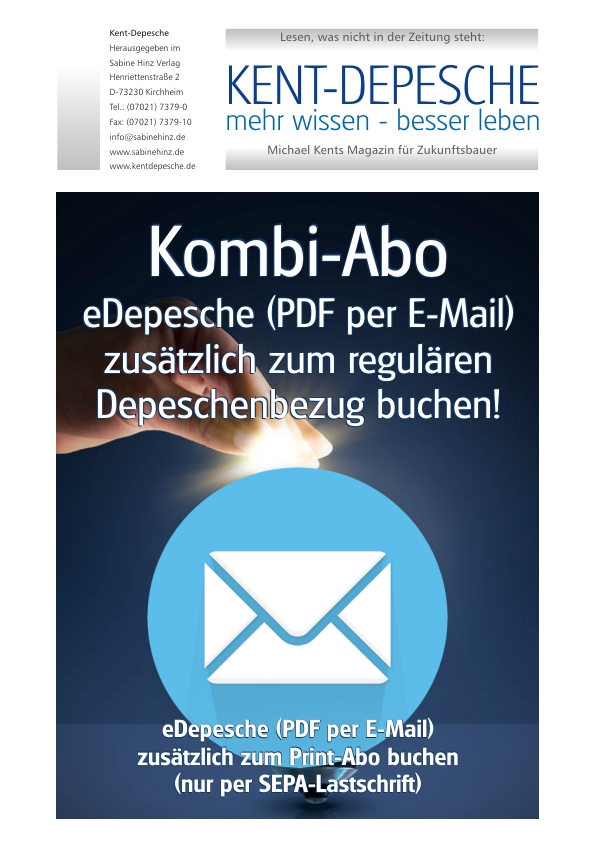 Sie erhalten zusätzlich zu Ihrer Depesche (Druckausgabe) die neueste Depesche jeweils auch als PDF per E-Mail zugesandt.