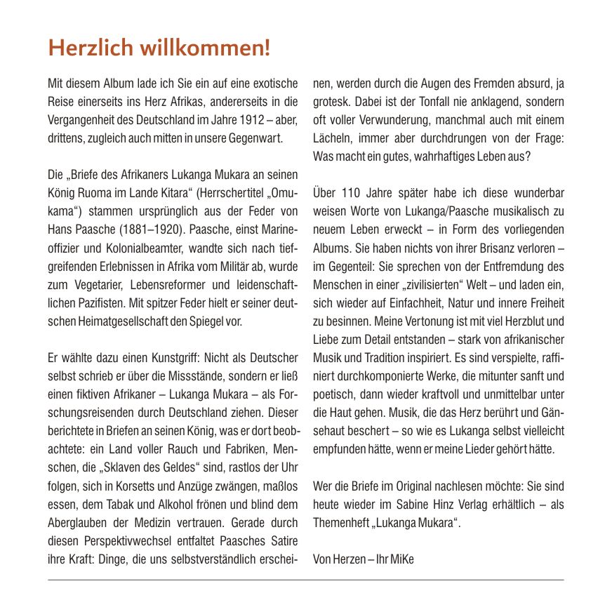 Nach vier Monaten kreativer Arbeit ist sie nun da, die Vertonung der Briefe des Lukanga Mukara: 19 Musikstücke, die aufeinander aufbauen und eine außergewöhnliche Geschichte erzählen: Der Lebensreformer Hans Paasche ließ im Jahr 1912 einen fiktiven Afrikaner, eben den Lukanga Mukara, ins wilhelminische Deutschland reisen und seinem König Ruoma im (damaligen) Lande Kitara in mehreren Briefen die Kultur der „Wasungu“ (Deutschen) schildern. Der besondere Reiz entsteht durch den Wechsel der Perspektive: Ein von jeder sog. Zivilisation verschonter Afrikaner richtet seinen ungetrübten Blick auf die hiesigen Sitten und Gebräuche und schildert sie seinem König.