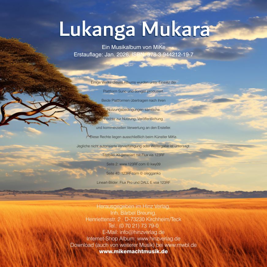 In meiner Vertonung verstehe ich den Lukanga aber nicht als Kritik. Es geht nur darum, unsere Welt einmal mit unverbrauchten Augen anzuschauen. Dabei werden wir erkennen, dass nicht alles, was wir hierzulande für gegeben und gut halten, dies auch ist … dass es auch auf andere Dinge ankommt als auf Fortschritt, Technik, Geld und Wirtschaftswachstum … dass es im Leben noch edlere Werte gibt als jene, die wir hierzulande hochhalten … dass es noch ganz andere Maßstäbe an das Leben gibt … dass man die Dinge anders werten kann, als wir es hier gewohnt sind. Das ist meine Botschaft der Lukanga-Lieder.