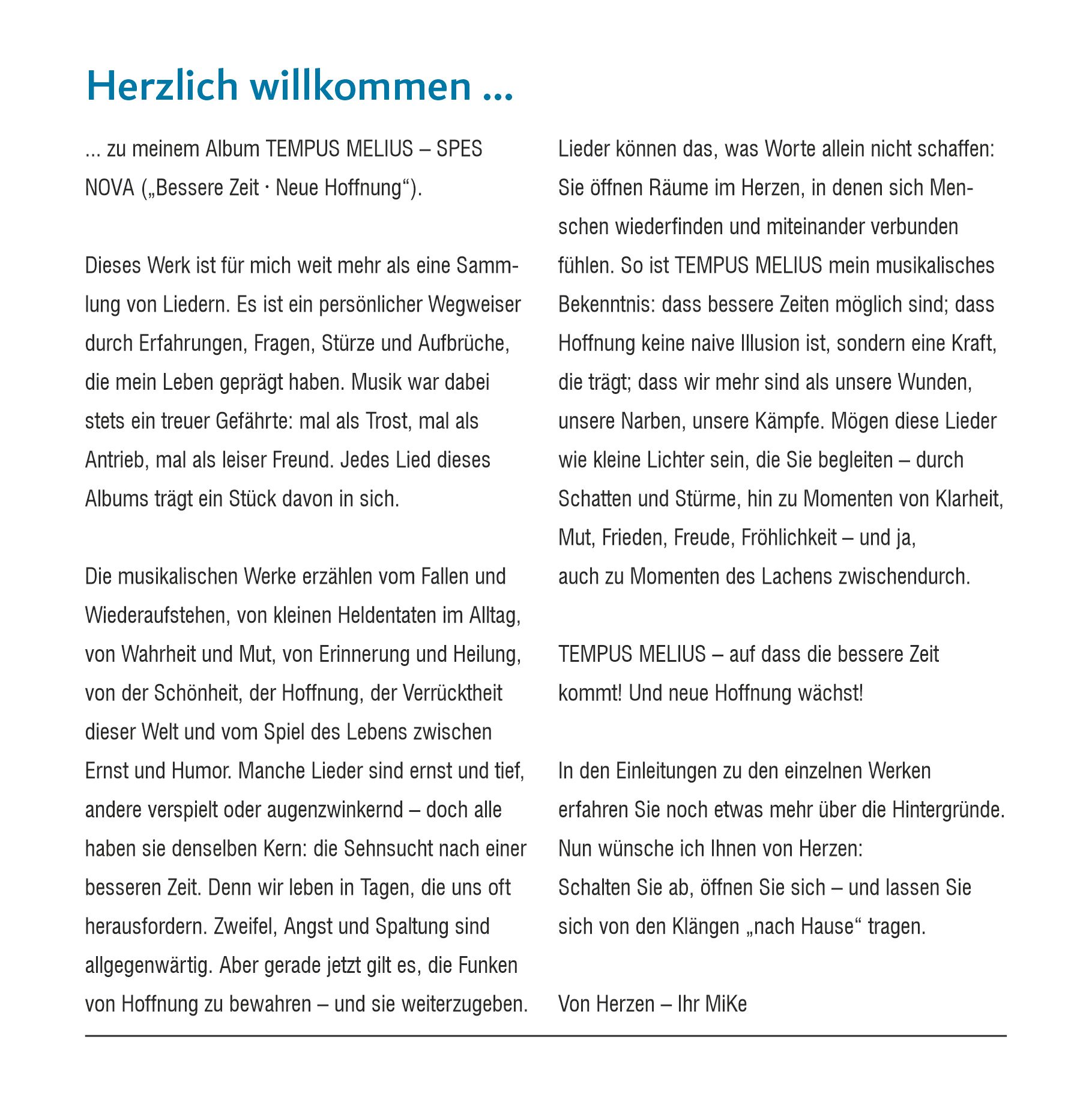 Lieder können das, was Worte allein nicht schaffen: Sie öffnen Räume im Herzen, in denen sich Menschen wiederfinden und miteinander verbunden fühlen. So ist TEMPUS MELIUS mein musikalisches Bekenntnis: dass bessere Zeiten möglich sind; dass Hoffnung keine naive Illusion ist, sondern eine Kraft, die trägt; dass wir mehr sind als unsere Wunden, unsere Narben, unsere Kämpfe. Mögen diese Lieder wie kleine Lichter sein, die Sie begleiten – durch Schatten und Stürme, hin zu Momenten von Klarheit, Mut, Frieden, Freude, Fröhlichkeit – und ja, auch zu Momenten des Lachens zwischendurch.