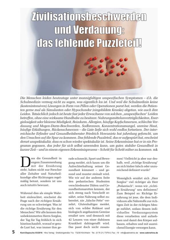 Der österreichische Gesundheitsberater Friedrich Howanietz hat jahrelang geforscht, um den Ursachen auf die Spur zu kommen. Das fehlende Puzzleteil, das er aufgespürt hat, erscheint derart unspektakulär, dass es schon wieder spektakulär ist. Seine Erkenntnisse hat er in ein Programm gegossen, das jeder für sich selbst anwenden kann, um guter, stabiler Gesundheit in kurzer Zeit – und in einem eigenen Erkenntnisprozess – Schritt für Schritt näher zu kommen.