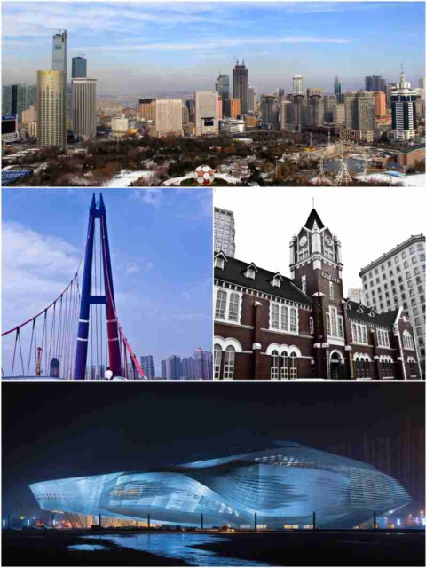 Collage von wikimedia commons, DalianSkyline.jpg, Citibank Dalian.jpg, Flickr original Dalian Int. Conference-Center.jpg, Flickr
