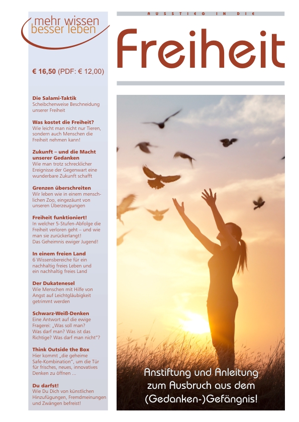 Der erste Schritt zum Ausstieg ist also geistiger Natur – ein gedanklicher Ausstieg aus der System-Matrix, ein geistiger Einstieg in die Regeln und Gesetze des wahren Lebens. Daher habe ich, extra im Zusammenhang mit dieser Depesche, ein neues Themenheft erstellt für alle uneinsichtigen Sklaven, für alle „Enthunder“, für alle „Neos“. Es heißt „ Ausstieg in die Freiheit : Anleitung und Anstiftung zum Ausbruch aus dem (Gedanken-) Gefängnis“. Darin enthalten sind Depeschenartikel, die mit der „Auswilderung“ zu haben, mit der Befreiung aus der Käfighaltung, mit der Auflösung geistiger Nebel, der Löschung feindlicher Gedankenviren usw.