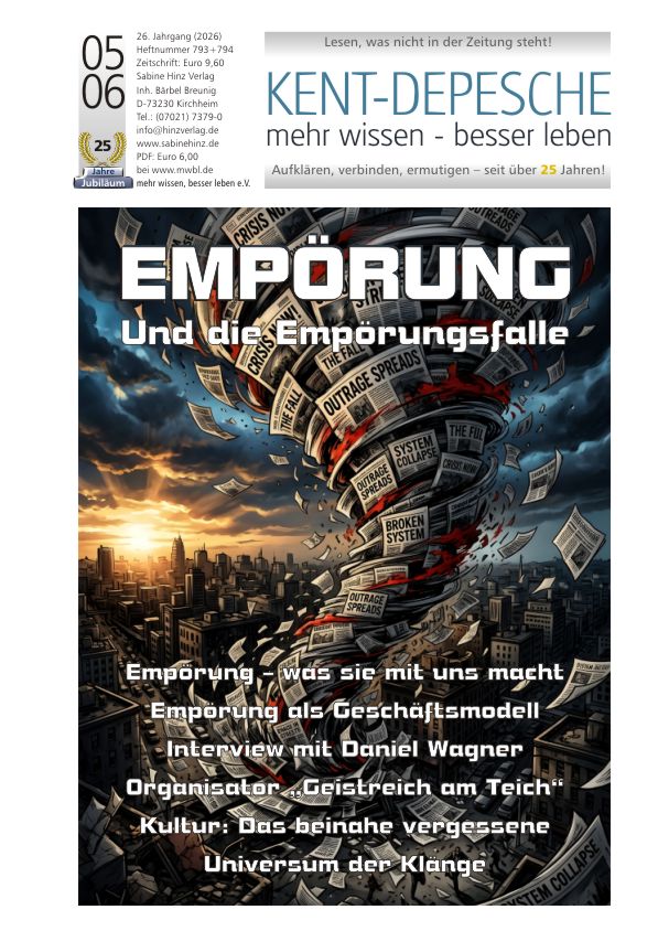 Die Welt ist wunderbar. Das Leben ist wunderbar! Aber vielleicht hat uns die Empörung innerlich schon aufgefressen? Mein heutiger Hauptartikel wirft daher einen genaueren Blick auf die versteckten, bisher weitgehend unbekannten Mechanismen der Empörung – und auf die oft übersehene Frage, warum sie uns so leicht in ihren Bann zieht – und dann mit sich in einen zerstörerischen Abwärtsstrudel reißt.