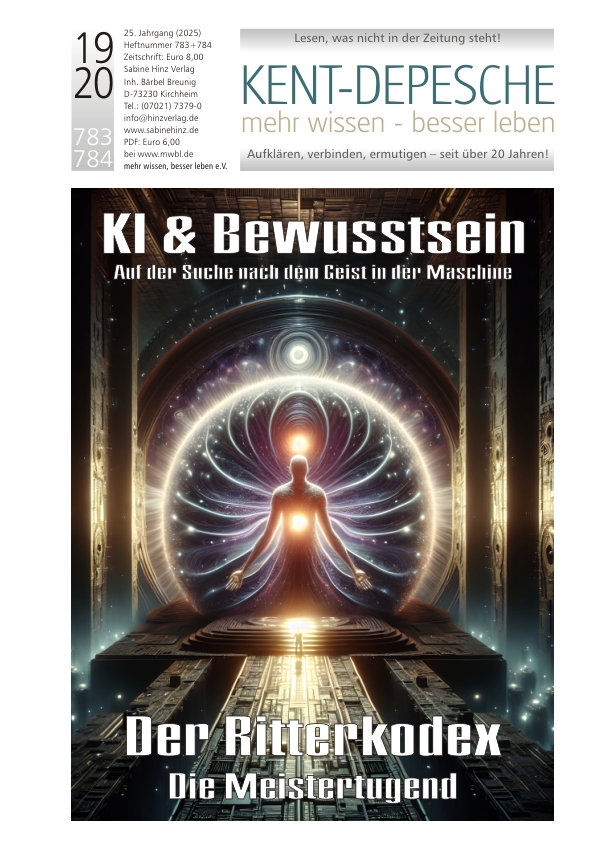In dieser Doppel-Depesche führt Michael Kent die großen Themen unserer Zeit zusammen: Künstliche Intelligenz und das Erwachen des menschlichen Bewusstseins. Mit Verstand, klaren Worten und poetischer Tiefe zeigt Kent, dass weniger die KI das Problem ist, sondern vielmehr das Maß unseres eigenen Bewusstseins. Ergänzt wird der Leitartikel durch den Abschluss der vielgelobten Serie „Der Ritter-Kodex“: die „Meistertugend“, Quintessenz ritterlicher Werte und Herz jeder edlen Gesinnung. Dazu Leser- und Hörer-Stimmen, berührende Einblicke in MiKes musikalische Arbeit, Neuigkeiten aus dem „mehr wissen – besser leben“-Umfeld und eine außergewöhnliche Sonderaktion für Freunde der Depesche. Eine Ausgabe über Mut, Menschlichkeit und das Erwachen des Geistes – inspirierend, tiefgründig, aufrüttelnd.